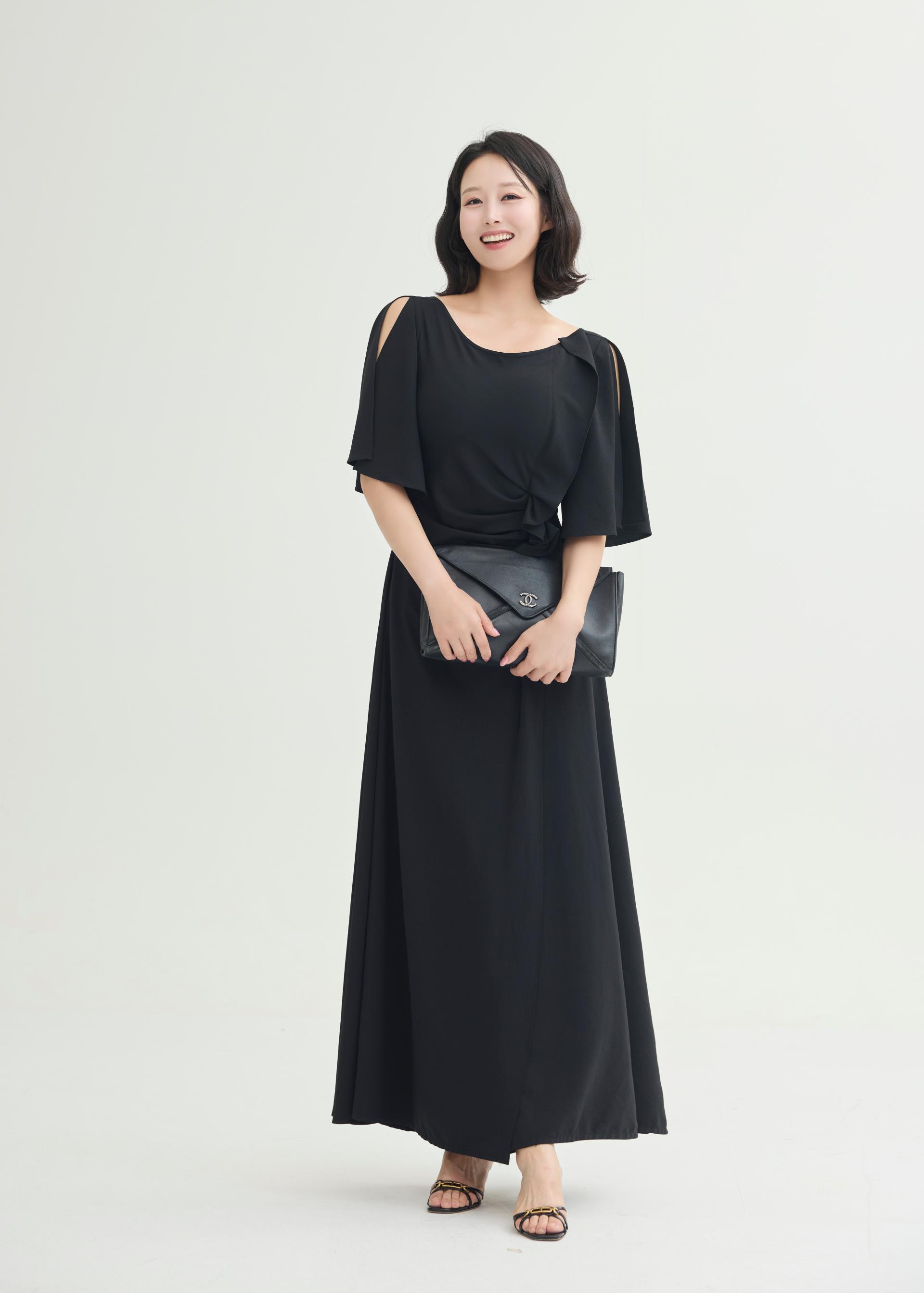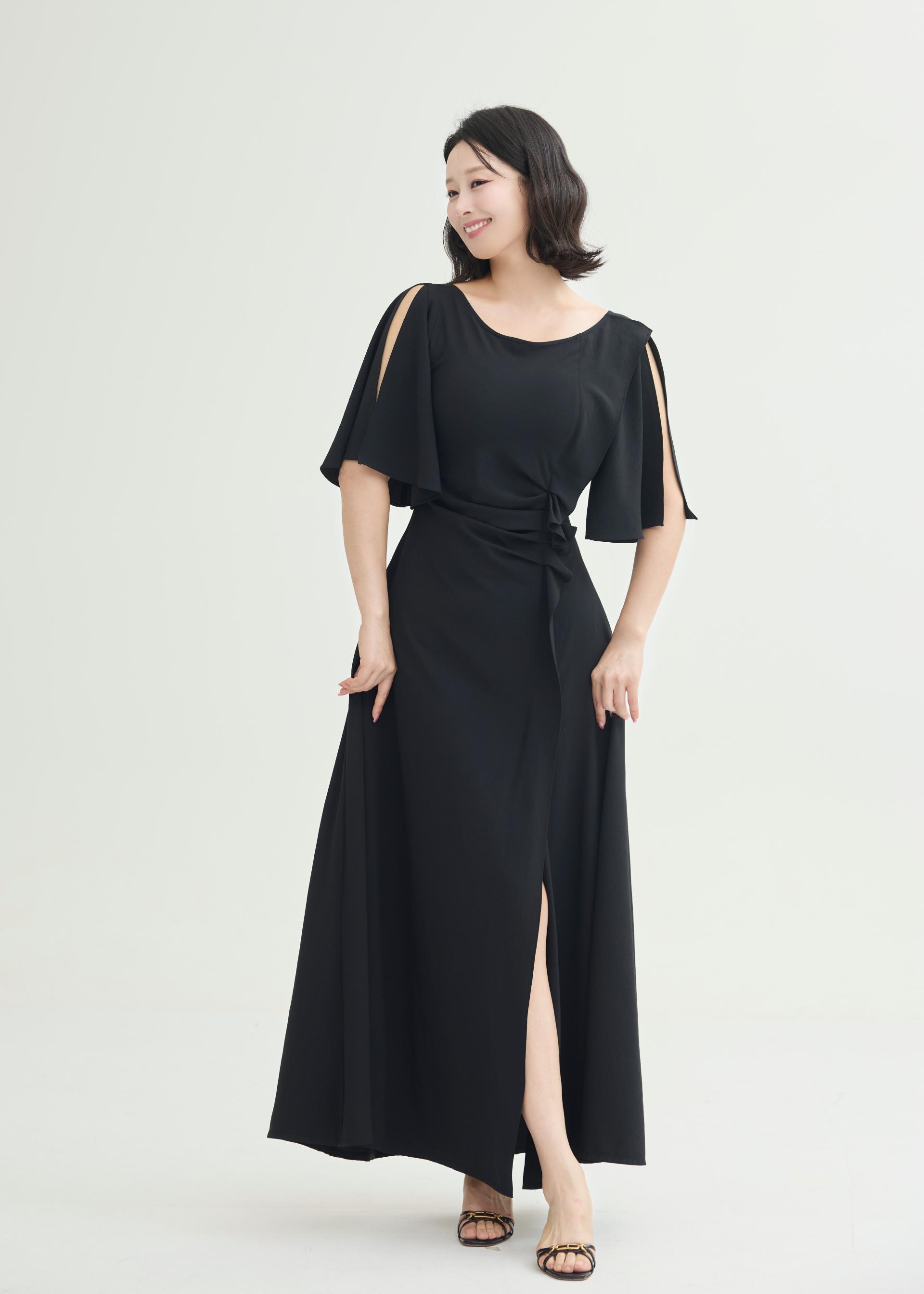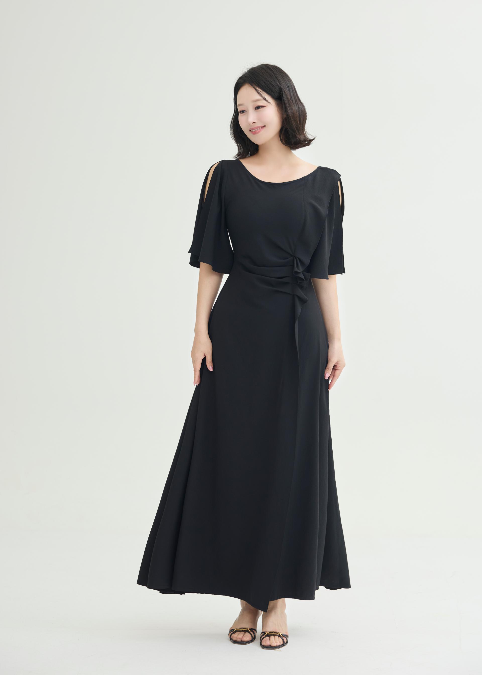 한밤의 우아함을 담은 미드나잇 셔링 롱 원피스.